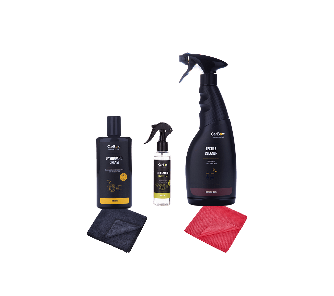 Sada autokozmetiky obsahuje produkty pre dôkladnú starostlivosť o interiér auta s textilnými povrchmi. Sada obsahuje krém na plastové časti interiéru auta Dashboard Cream s aplikačnou mikrovláknoovu utierkou, pohlcovač pachou Neutralizer Green Tea a čistič textilných sedačiek a textilných povrchou spolu s čistiacou mikrovláknovou utierkou.